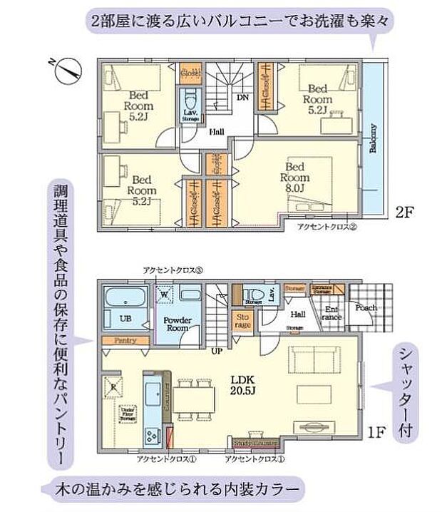 | 間取り | 4LDK 間取り内訳:リビングダイニングキッチン 20.5帖(1階)・洋室 5.2帖(2階)・洋室 5.2帖(2階)・洋室 8帖(2階)・洋室 5.2帖(2階) |