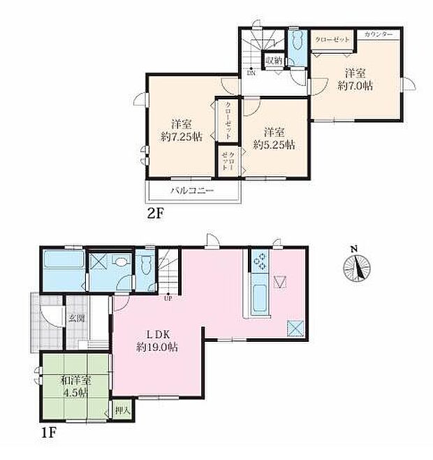 間取り内訳:リビングダイニングキッチン 19帖(1階)・和室 4.5畳(1階)・洋室 7.2帖(2階)・洋室 5.2帖(2階)・洋室 7帖(2階)