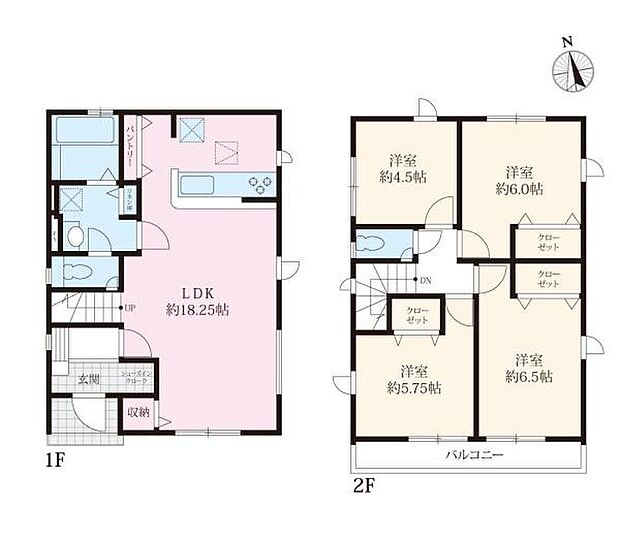 | 間取り | 4LDK 間取り内訳:リビングダイニングキッチン 18.2帖(1階)・洋室 5.7帖(2階)・洋室 6.5帖(2階)・洋室 6帖(2階)・洋室 4.5帖(2階) |