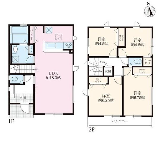 | 間取り | 4LDK 間取り内訳:リビングダイニングキッチン 18帖(1階)・洋室 6.2帖(2階)・洋室 6.7帖(2階)・洋室 4.5帖(2階)・洋室 4.5帖(2階) |