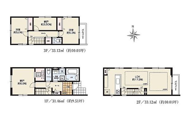 | 間取り | 2SLDK 間取り内訳:収納 6.9帖(1階)・リビングダイニングキッチン 17.9帖(2階)・洋室 5.3帖(3階)・洋室 5帖(3階)・収納 3.5帖(3階) |