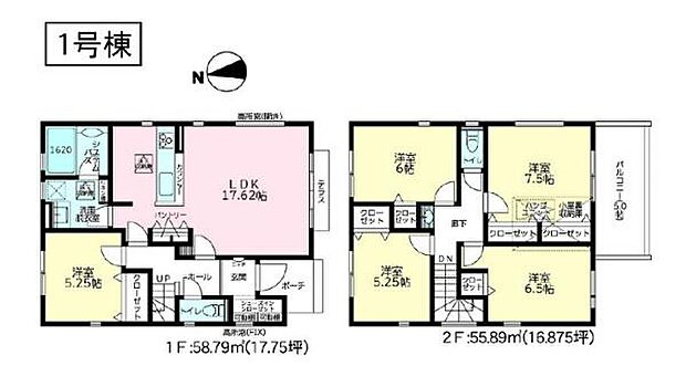 | 間取り | 5LDK 間取り内訳:リビングダイニングキッチン 17.6帖(1階)・洋室 5.2帖(1階)・洋室 7.5帖(2階)・洋室 6.5帖(2階)・洋室 6帖(2階)・洋室 5.2帖(2階) |