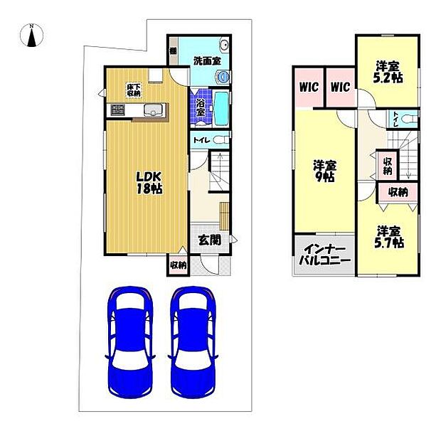 | 間取り | 3LDK 間取り内訳:リビングダイニングキッチン 18帖(1階)・洋室 6.2帖(2階)・洋室 6.5帖(2階)・洋室 9帖(2階) |