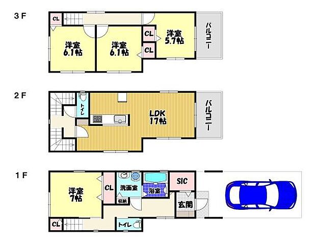| 間取り | 4LDK 間取り内訳:洋室 7帖(1階)・リビングダイニングキッチン 17帖(1階)・洋室 5.7帖(3階)・洋室 6.1帖(3階)・洋室 6.1帖(3階) |