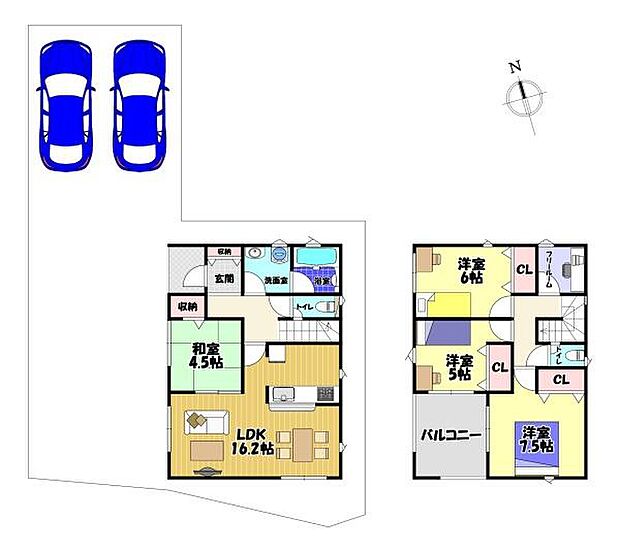 | 間取り | 4LDK 間取り内訳:リビングダイニングキッチン 16.2帖(1階)・和室 4.5畳(1階)・洋室 5帖(2階)・洋室 6帖(2階)・洋室 7.5帖(2階) |