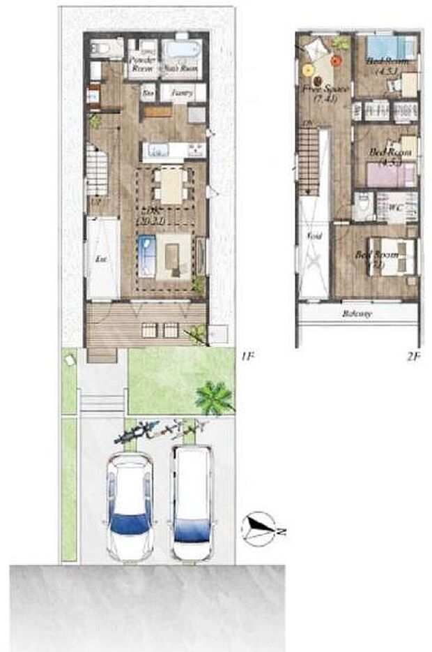 | 間取り | 3LDK 間取り内訳:リビングダイニングキッチン 20.2帖(1階)・洋室 7帖(2階)・洋室 4.5帖(2階)・洋室 4.5帖(2階) |