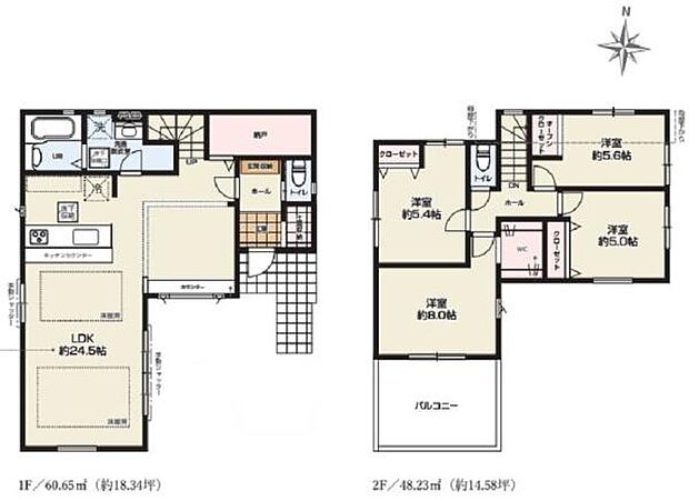 | 間取り | 4LDK 間取り内訳:リビングダイニングキッチン 24.5帖(1階)・洋室 8帖(2階)・洋室 5.6帖(2階)・洋室 5.4帖(2階)・洋室 5帖(2階) |