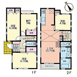| 間取り | 3SLDK 間取り内訳:洋室 6帖(1階)・洋室 5.9帖(1階)・収納 5帖(1階)・リビングダイニングキッチン 15.5帖(2階)・洋室 4.7帖(2階) |