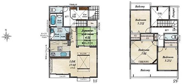 | 間取り | 4LDK 間取り内訳:リビングダイニングキッチン 17帖(1階)・和室 4.5畳(1階)・洋室 7帖(2階)・洋室 5.2帖(2階)・洋室 5.2帖(2階) |