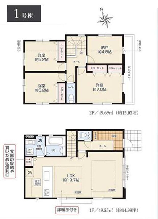 | 間取り | 3SLDK 間取り内訳:リビングダイニングキッチン 19.7帖(1階)・洋室 7帖(2階)・洋室 5.2帖(2階)・洋室 5.2帖(2階)・収納 4.8帖(2階) |