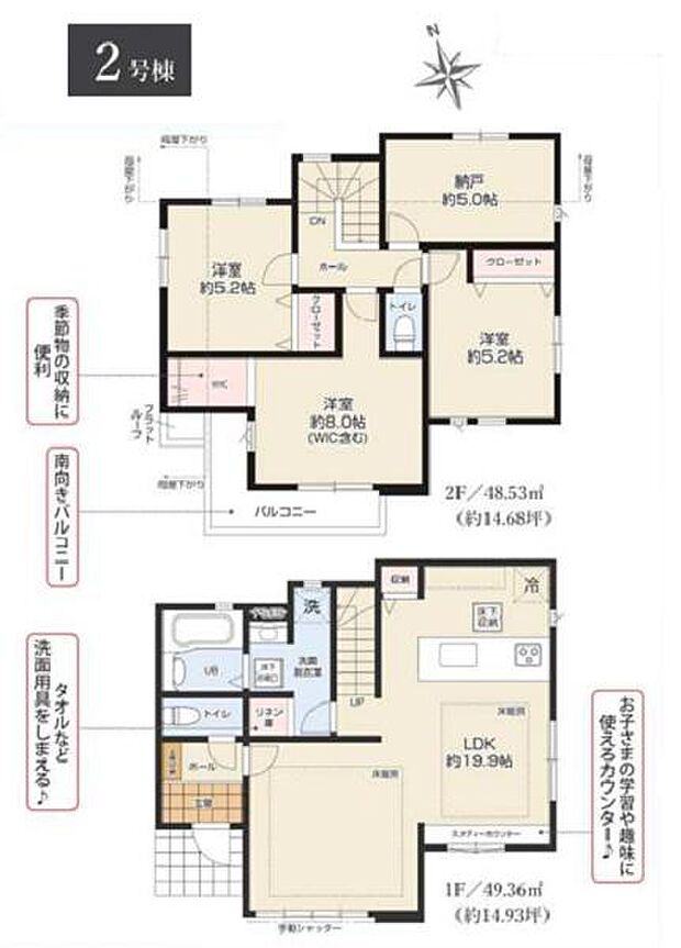 間取り内訳:リビングダイニングキッチン 19.9帖(1階)・洋室 8帖(2階)・洋室 5.2帖(2階)・洋室 5.2帖(2階)・収納 5帖(2階)