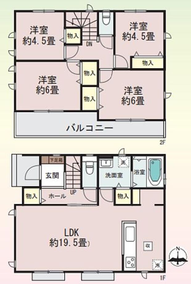 | 間取り | 4LDK 間取り内訳:リビングダイニングキッチン 19.5帖(1階)・洋室 6帖(2階)・洋室 6帖(2階)・洋室 4.5帖(2階)・洋室 4.5帖(2階) |