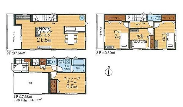| 間取り | 3SLDK 間取り内訳:収納 6.5帖(1階)・リビングダイニングキッチン 21.5帖(2階)・洋室 7帖(3階)・洋室 6帖(3階)・洋室 4.5帖(3階) |