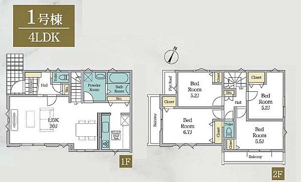 | 間取り | 4LDK 間取り内訳:リビングダイニングキッチン 20帖(1階)・洋室 6.7帖(2階)・洋室 5.5帖(2階)・洋室 5.2帖(2階)・洋室 5.2帖(2階) |