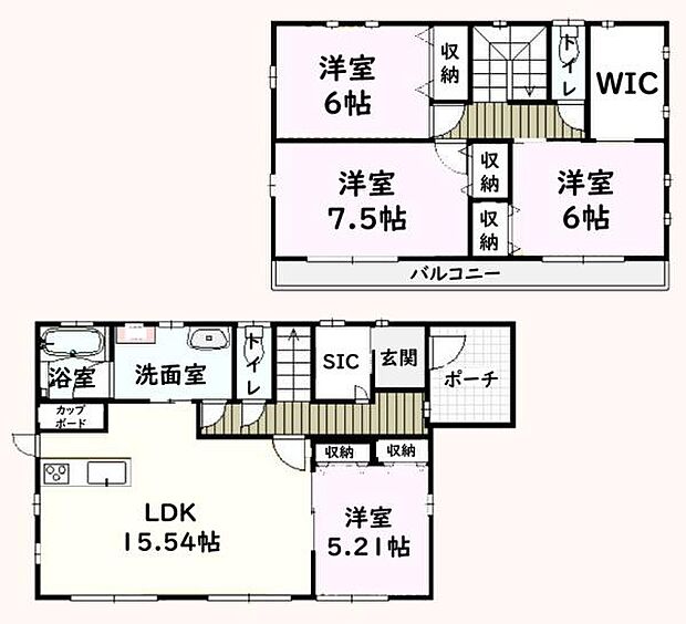 | 間取り | 4LDK 間取り内訳:リビングダイニングキッチン 15.5帖(1階)・洋室 5.2帖(1階)・洋室 7.5帖(2階)・洋室 6帖(2階)・洋室 6帖(2階) |