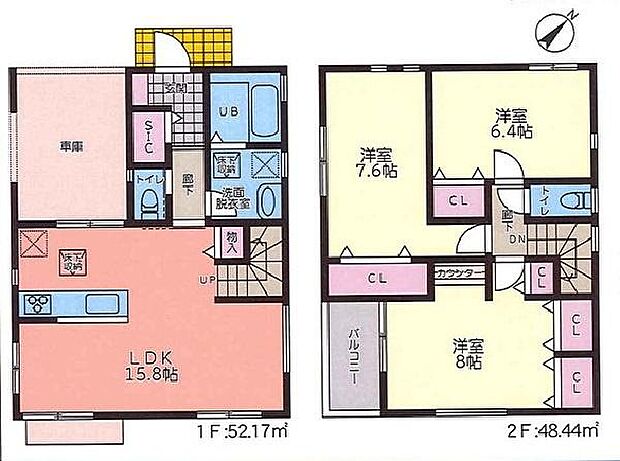 | 間取り | 3LDK 間取り内訳:リビングダイニングキッチン 15.8帖(1階)・洋室 8帖(2階)・洋室 7.6帖(2階)・洋室 6.4帖(2階) |