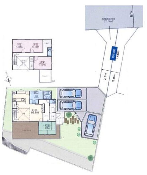 | 間取り | 3LDK 間取り内訳:リビングダイニングキッチン 16.8帖(1階)・和室 6畳(1階)・洋室 10.6帖(2階)・洋室 7.5帖(2階) |