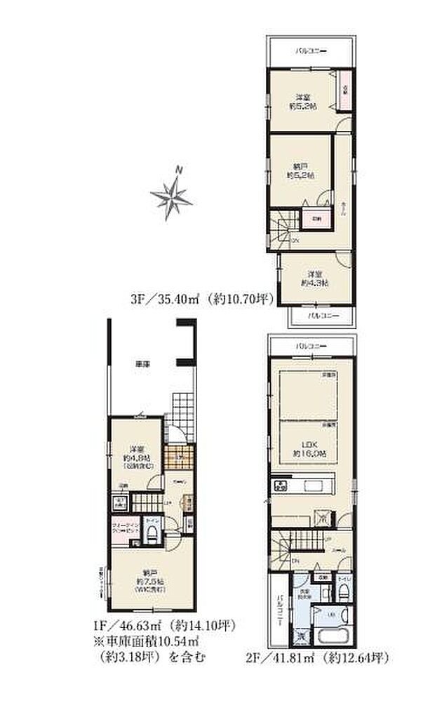 | 間取り | 3SLDK 間取り内訳:収納 7.5帖(1階)・リビングダイニングキッチン 16帖(2階)・洋室 5.2帖(3階)・洋室 4.3帖(3階)・収納 5.2帖(3階) |