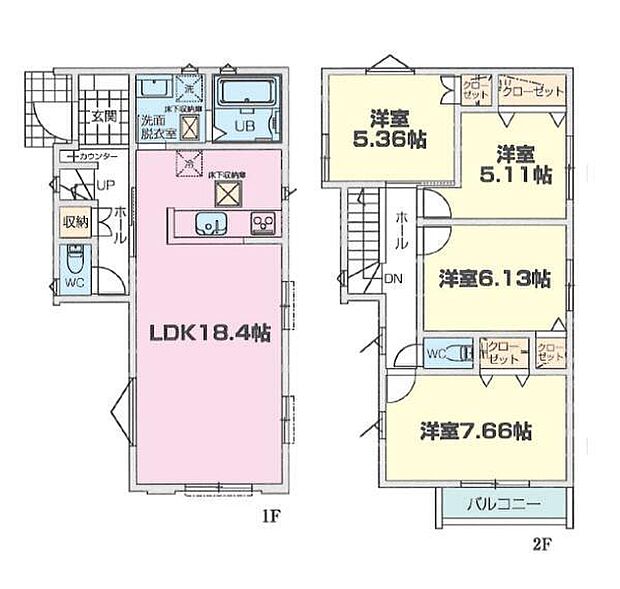 | 間取り | 4LDK 間取り内訳:リビングダイニングキッチン 18.4帖(1階)・洋室 7.6帖(2階)・洋室 6.1帖(2階)・洋室 5.1帖(2階)・洋室 5.3帖(2階) |