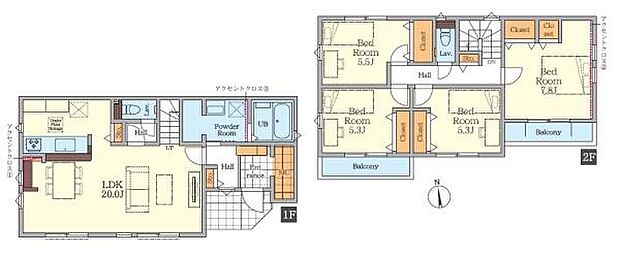 | 間取り | 4LDK 間取り内訳:リビングダイニングキッチン 20帖(1階)・洋室 5.5帖(2階)・洋室 5.3帖(2階)・洋室 5.3帖(2階)・洋室 7.8帖(2階) |