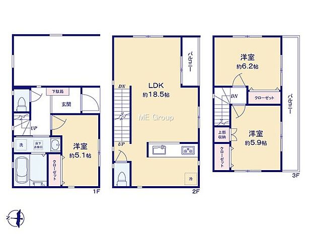 | 間取り | 3LDK 間取り内訳:洋室 5.1帖・リビングダイニングキッチン 18.5帖・洋室 6.2帖・洋室 5.9帖 |