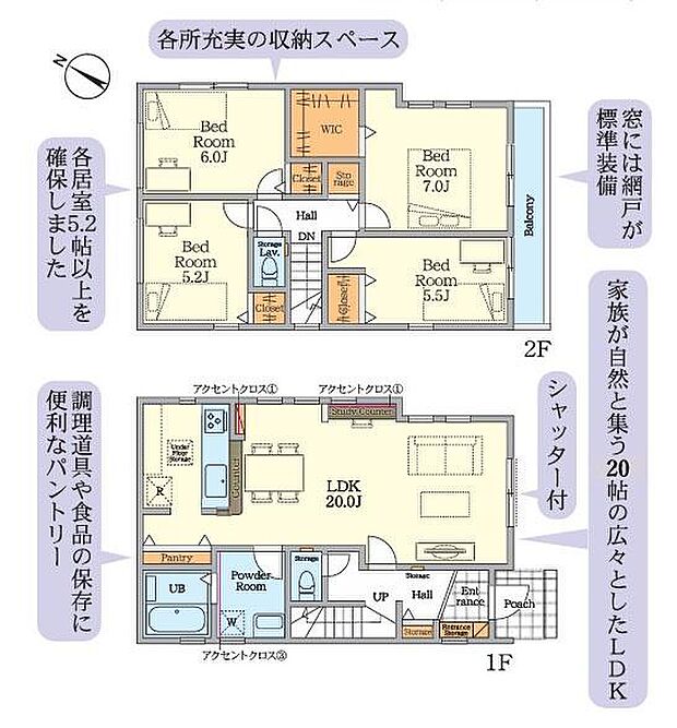 | 間取り | 4LDK 間取り内訳:リビングダイニングキッチン 20帖(1階)・洋室 6帖(2階)・洋室 7帖(2階)・洋室 5.5帖(2階)・洋室 5.2帖(2階) |