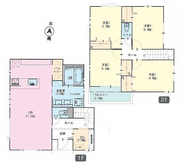 間取り内訳:洋室 5.2帖(2階)・洋室 6帖(2階)・洋室 6帖(2階)・洋室 5.2帖(2階)・リビングダイニングキッチン 17帖(1階)