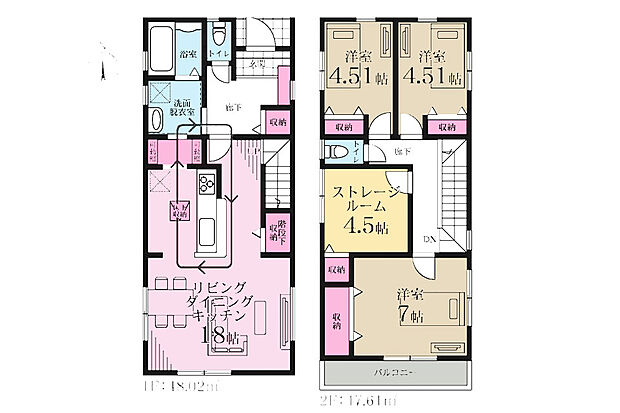 | 間取り | 3SLDK 間取り内訳:リビングダイニングキッチン 18帖(1階)・洋室 7帖(2階)・洋室 4.5帖(2階)x2・収納 4.5帖(2階) |