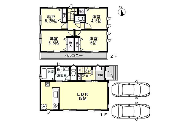| 間取り | 3SLDK 間取り内訳:リビングダイニングキッチン 19帖(1階)・洋室 6.5帖(2階)・洋室 5帖(2階)・洋室 4.5帖(2階)・収納 5.2帖(2階) |