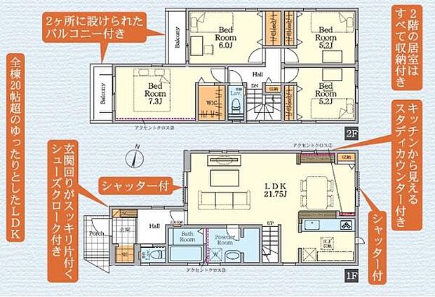 | 間取り | 4LDK 間取り内訳:リビングダイニングキッチン 21.7帖(1階)・洋室 6帖(2階)・洋室 7.3帖(2階)・洋室 5.2帖(2階)・洋室 5.2帖(2階) |