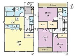 | 間取り | 3LDK 間取り内訳:リビングダイニングキッチン 18帖(1階)・洋室 5帖(2階)・洋室 6帖(2階)x2 |