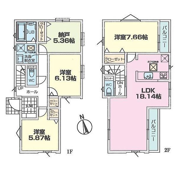 | 間取り | 3SLDK 間取り内訳:収納 5.3帖(1階)・洋室 6.1帖(1階)・洋室 5.8帖(1階)・洋室 7.6帖(2階)・リビングダイニングキッチン 18.1帖(2階) |