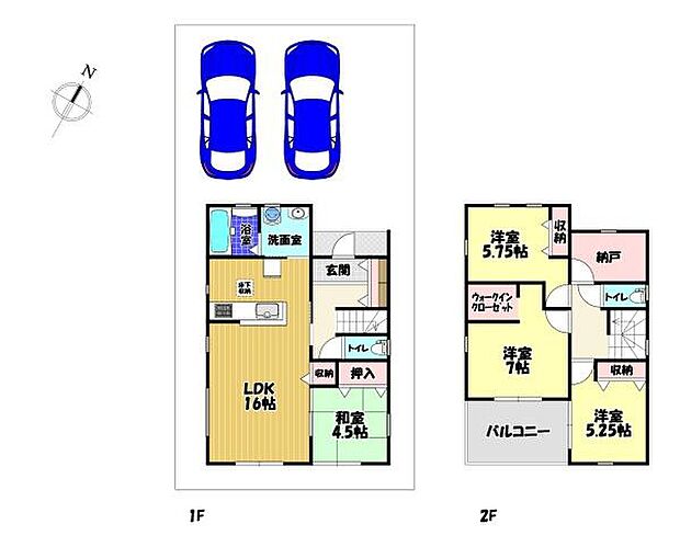 | 間取り | 4SLDK 間取り内訳:リビングダイニングキッチン 16帖(1階)・和室 4.5畳(1階)・洋室 5.2帖(2階)・洋室 5.7帖(2階)・洋室 7帖(2階) |