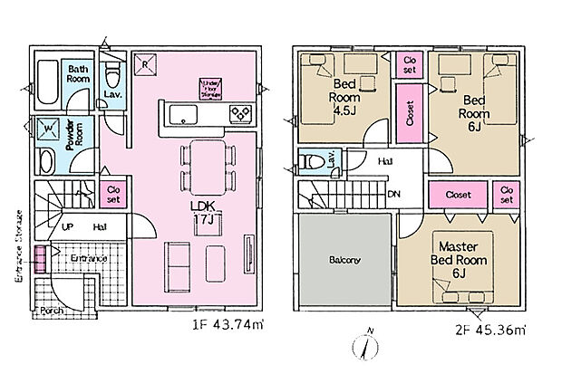 | 間取り | 3LDK 間取り内訳:リビングダイニングキッチン 17帖(1階)・洋室 6帖(2階)x2・洋室 4.5帖(2階) |