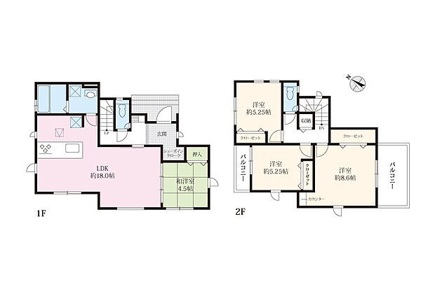 | 間取り | 4LDK 間取り内訳:洋室 5.2帖(2階)x2・洋室 8.6帖(2階)・リビングダイニングキッチン 18帖(1階)・和室 4.5畳(1階) |