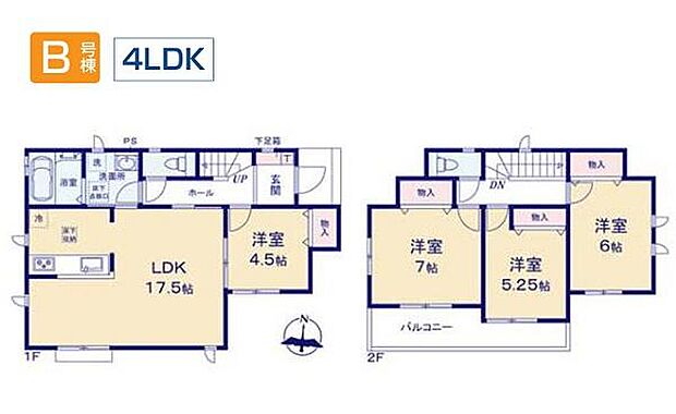 | 間取り | 4LDK 間取り内訳:リビングダイニングキッチン 17.5帖(1階)・洋室 4.5帖(1階)・洋室 7帖(2階)・洋室 6帖(2階)・洋室 5.2帖(2階) |
