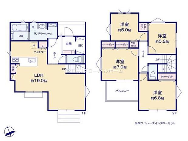 | 間取り | 4LDK 間取り内訳:リビングダイニングキッチン 19帖(1階)・洋室 5帖(2階)・洋室 5.2帖(2階)・洋室 7帖(2階)・洋室 6.8帖(2階) |