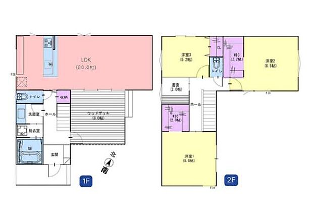 | 間取り | 3LDK 間取り内訳:リビングダイニングキッチン 20帖(1階)・洋室 8.5帖(2階)・洋室 8帖(2階)・洋室 5.2帖(2階) |
