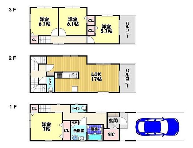 | 間取り | 4LDK 間取り内訳:洋室 7帖(1階)・リビングダイニングキッチン 17帖(1階)・洋室 5.7帖(3階)・洋室 6.1帖(3階)・洋室 6.1帖(3階) |