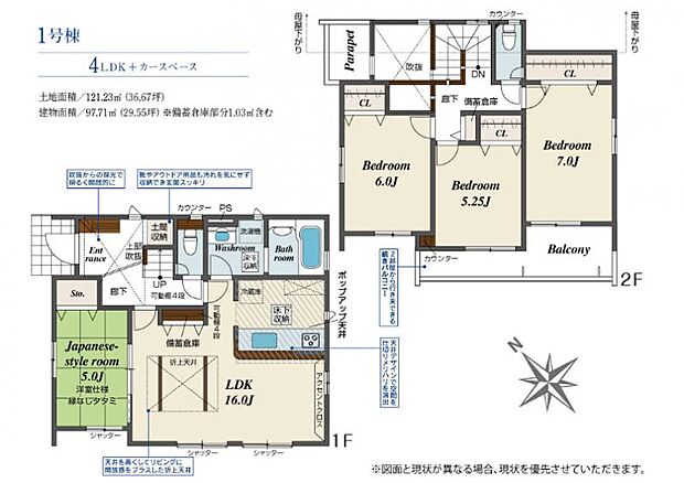 | 間取り | 4LDK 間取り内訳:リビングダイニングキッチン 16帖(1階)・和室 5畳(1階)・洋室 7帖(2階)・洋室 6帖(2階)・洋室 5.2帖(2階) |