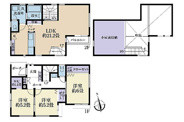 | 間取り | 3LDK 間取り内訳:洋室 6帖(1階)・洋室 5.2帖(1階)x2・リビングダイニングキッチン 21.2帖(2階) |