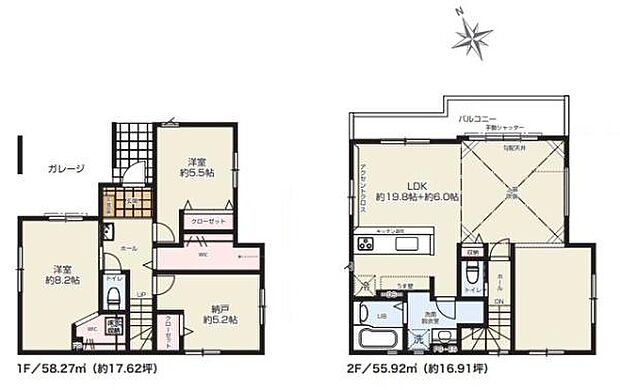 | 間取り | 2SLDK 間取り内訳:洋室 8.2帖(1階)・洋室 5.5帖(1階)・収納 5.2帖(1階)・リビングダイニング 19.8帖(2階)・キッチン 6帖(2階) |