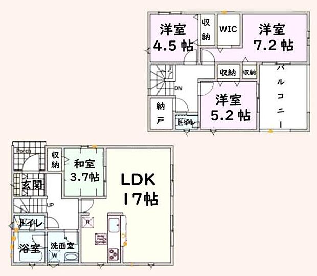 | 間取り | 4SLDK 間取り内訳:リビングダイニングキッチン 17帖(1階)・和室 3.7畳(1階)・洋室 7.2帖(2階)・洋室 5.2帖(2階)・洋室 4.5帖(2階) |