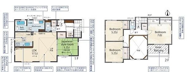 | 間取り | 4LDK 間取り内訳:リビングダイニングキッチン 17.5帖(1階)・和室 5.2畳(1階)・洋室 7帖(2階)・洋室 5.2帖(2階)・洋室 5.2帖(2階) |