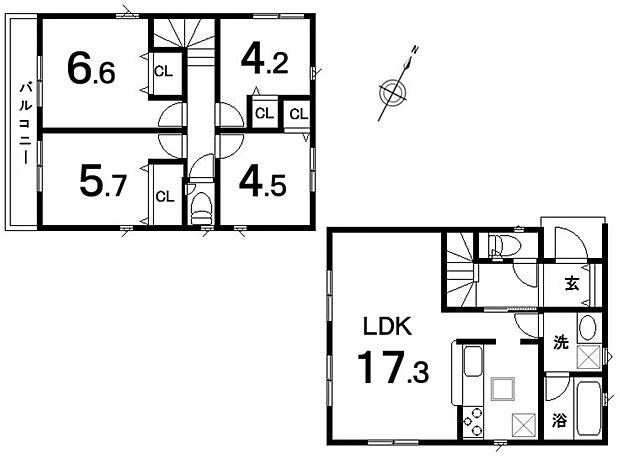 | 間取り | 4LDK 間取り内訳:リビングダイニングキッチン 17.3帖(1階)・洋室 6.6帖(2階)・洋室 5.7帖(2階)・洋室 4.5帖(2階)・洋室 4.2帖(2階) |
