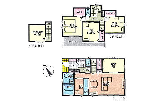 | 間取り | 4LDK(他:小屋裏収納) 間取り内訳:洋室 6.3帖(2階)・その他 4.5帖(3階)・リビングダイニングキッチン 18帖(1階)・洋室 5帖(1階)・洋室 5.2帖(2階)x2 |