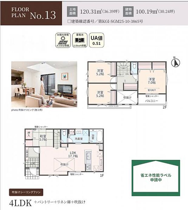 | 間取り | 4LDK 間取り内訳:リビングダイニングキッチン 17.7帖(1階)・和室 3.7畳(1階)・洋室 7帖(2階)・洋室 5.2帖(2階)x2 |