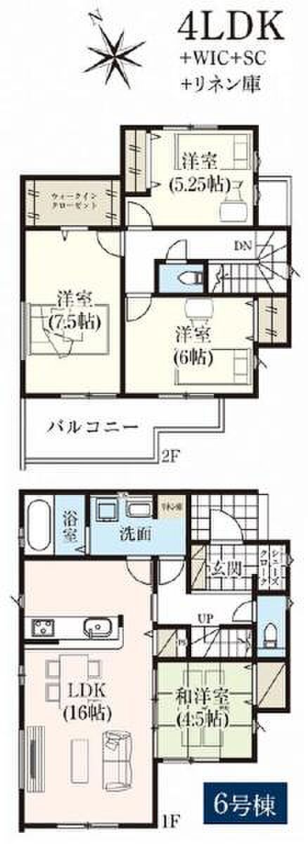 | 間取り | 4LDK 間取り内訳:リビングダイニングキッチン 16帖(1階)・和室 4.5畳(1階)・洋室 5.2帖(2階)・洋室 6帖(2階)・洋室 7.5帖(2階) |