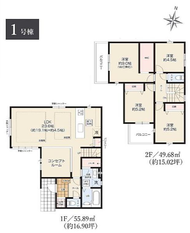 | 間取り | 4LDK 間取り内訳:リビングダイニングキッチン 23.6帖(1階)・洋室 9帖(2階)・洋室 5.2帖(2階)・洋室 5.2帖(2階)・洋室 4.5帖(2階) |