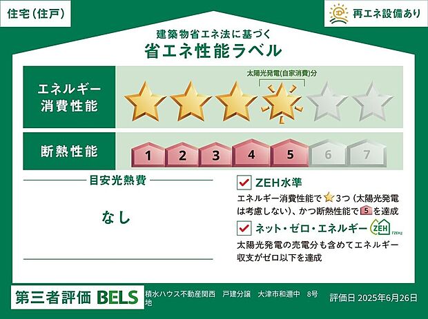 - 星マークの数が多いほどエネルギー消費性能が高いことを示しています。再エネ設備のない住宅は★0~★4の5段階評価、再エネ設備がある住宅は★0~★6の7段階評価となります。